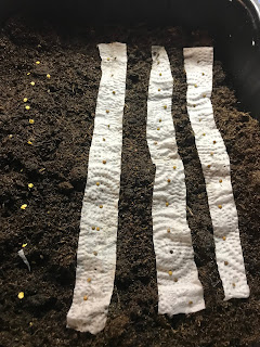 Tänä vuonna ajattelin epäonnistua tällätavoin, talouspaperisuikaleen päälle yritin ripotella siemeniä niin, että ne olisivat järkevillä väleillä heti alkuunsa. Harventamisvaiheeseen ei varmaankaan nytkään päästä, mutta kiva katsoa mikä itää ja millä tavoin.