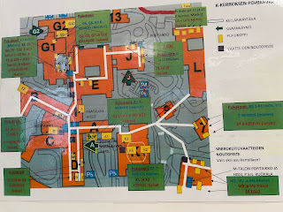 H tarkoittaa harjoittelua. Kolme edellistä kuvaa kertovat siitä. Oma pukukaappi jolle on suunnistettava melkoinen matka maanalaisia reittejä pitkin parkkitalosta B-rakennuksen kautta takaisin K-taloon. Alimmassa kuvassa kurssikaverin koipi Hoitopolkupäivän leikkaussalirastilla.